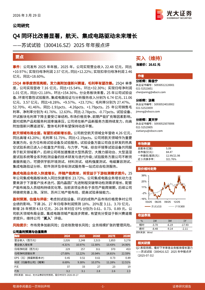 苏试试验:光大证券-苏试试验-300416-2025年年报点评:Q4同环比改善显著,航天、集成电路驱动未来增长-260329