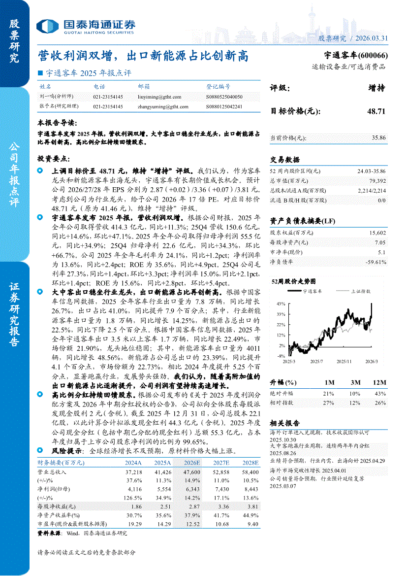 宇通客车:国泰海通证券-宇通客车-600066-2025年报点评:营收利润双增,出口新能源占比创新高-260331