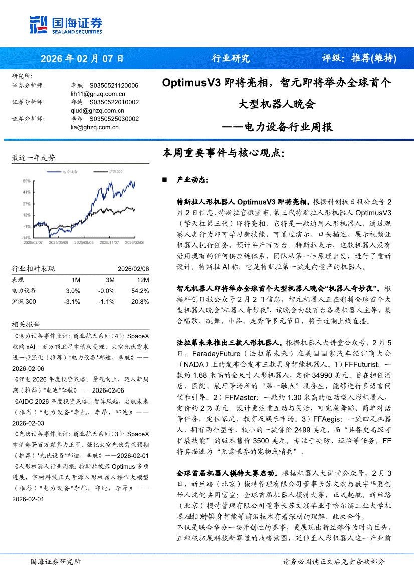 电力设备行业:国海证券-电力设备行业周报:OptimusV3即将亮相,智元即将举办全球首个大型机器人晚会-260207