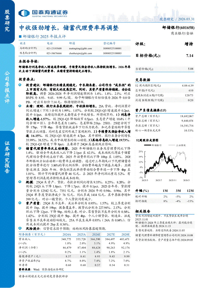 邮储银行:国泰海通证券-邮储银行-601658-2025年报点评:中收强劲增长,储蓄代理费率再调整-260331