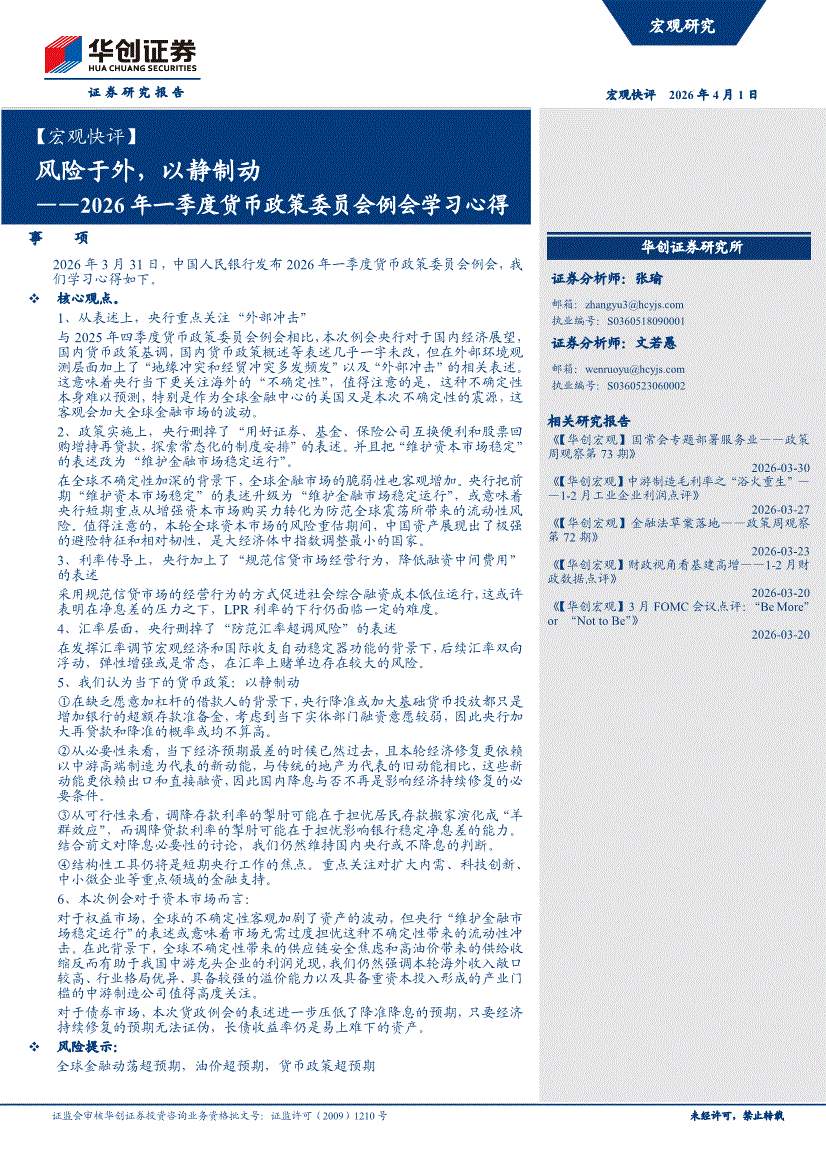 华创证券-【宏观快评】风险于外,以静制动——2026年一季度货币政策委员会例会学习心得-260401