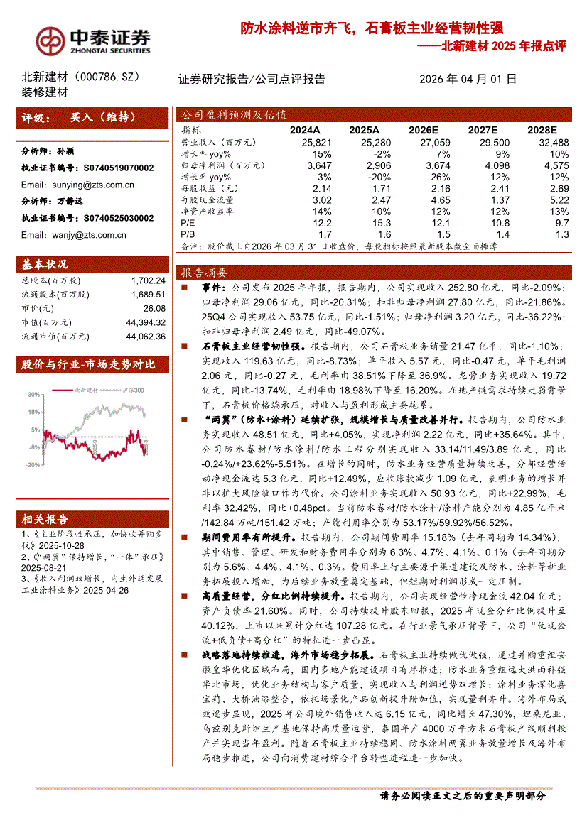北新建材:中泰证券-北新建材-000786-2025年报点评:防水涂料逆市齐飞,石膏板主业经营韧性强-260401