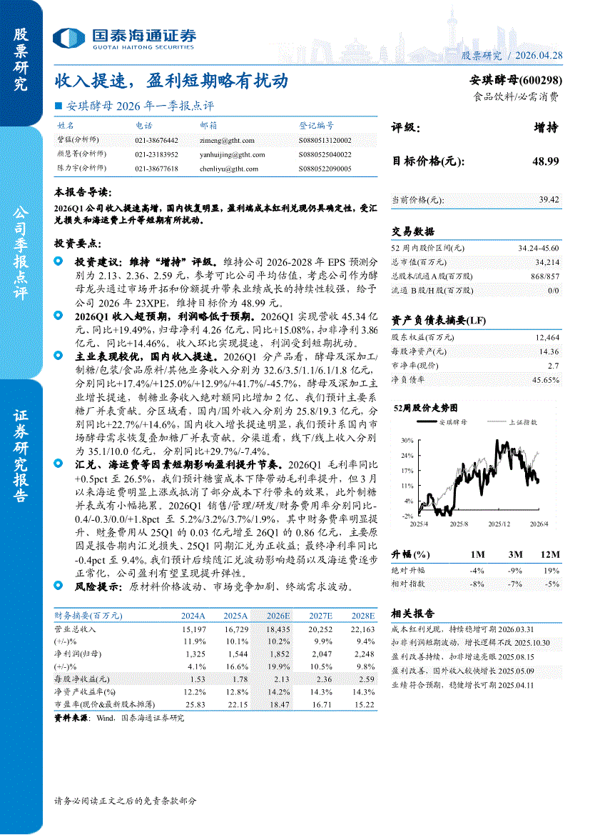 安琪酵母:国泰海通证券-安琪酵母-600298-2026年一季报点评:收入提速,盈利短期略有扰动-260428