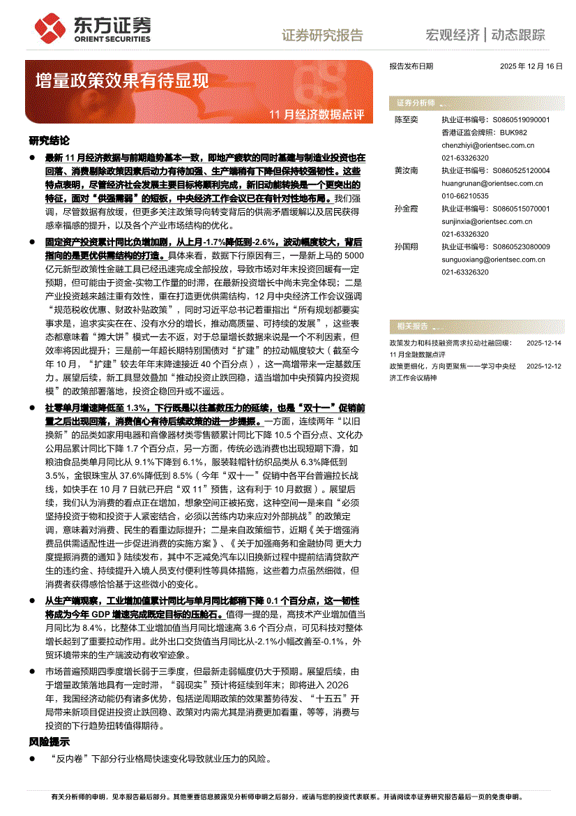 东方证券-11月经济数据点评:增量政策效果有待显现-251216