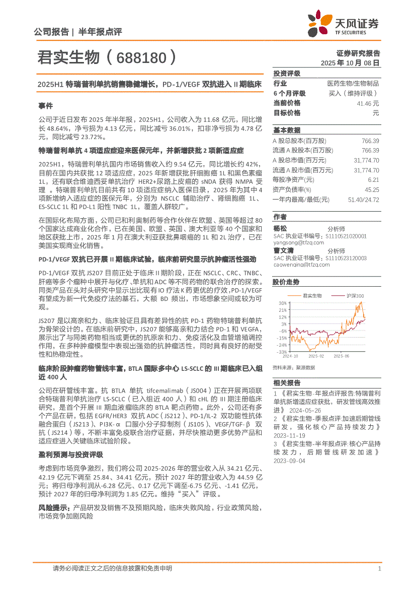 君实生物:天风证券-君实生物-688180-2025H1特瑞普利单抗销售稳健增长,PD~1/VEGF双抗进入II期临床-251008