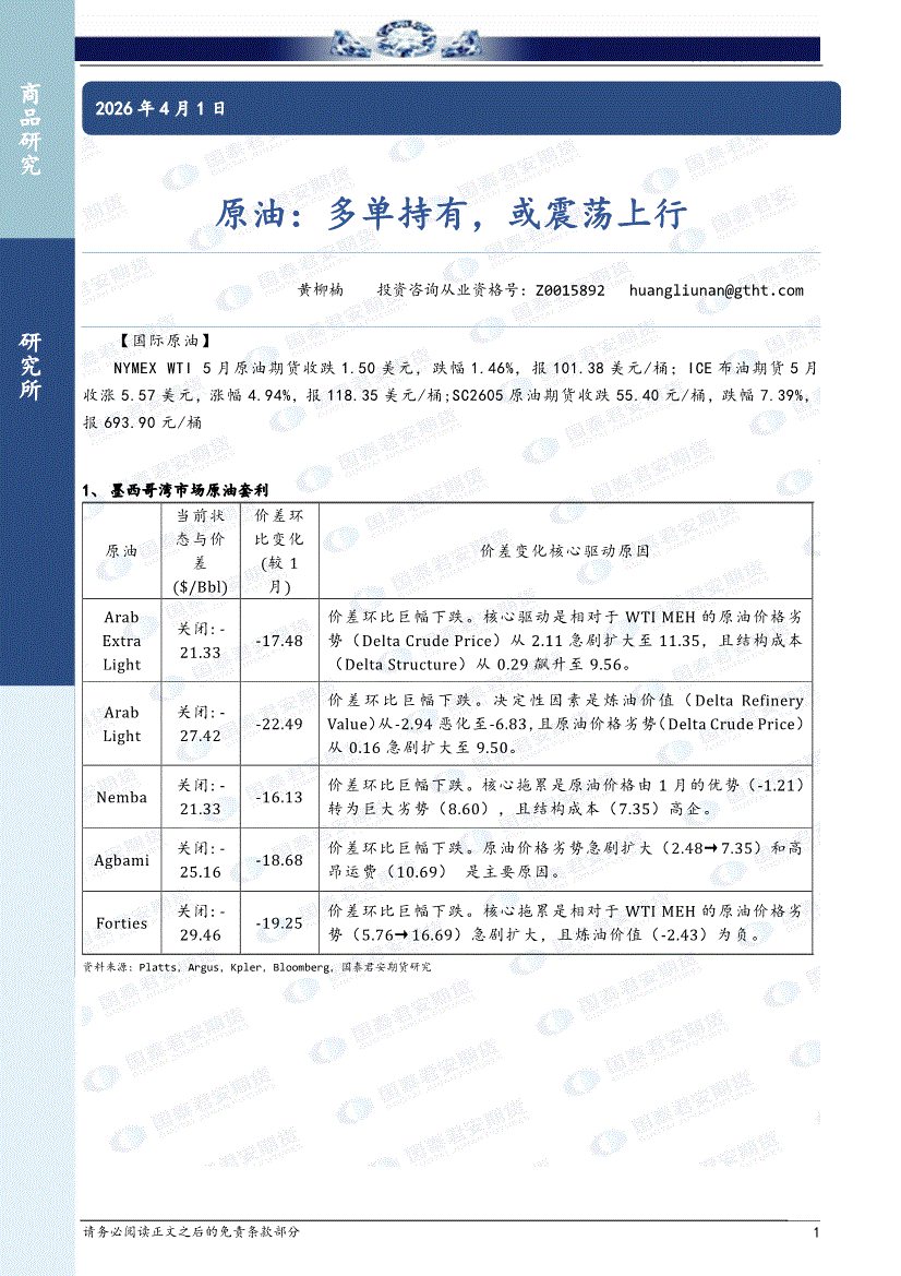 国泰君安期货-原油:多单持有,或震荡上行-260401