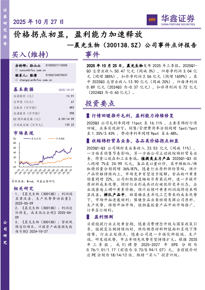 晨光生物:华鑫证券-晨光生物-300138-公司事件点评报告:价格拐点初显,盈利能力加速释放-251027