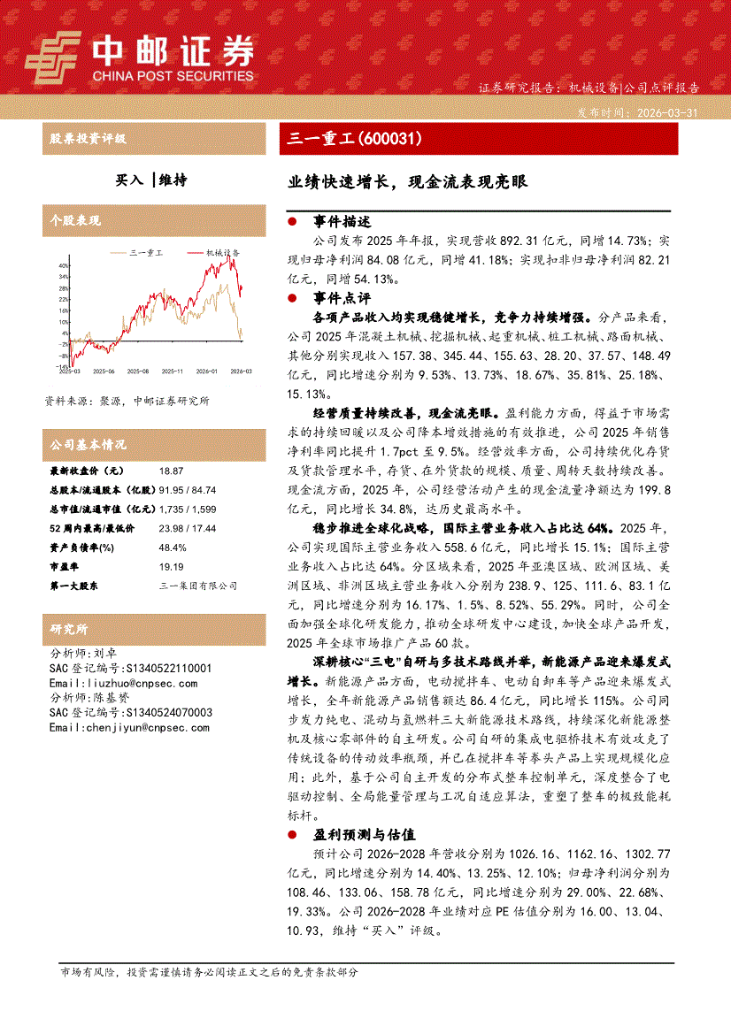 三一重工:中邮证券-三一重工-600031-业绩快速增长,现金流表现亮眼-260331
