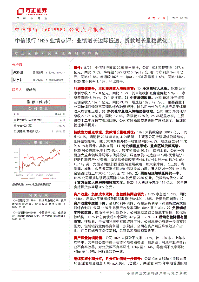 中信银行:方正证券-中信银行-601998-公司点评报告:1H25业绩点评,业绩增长边际提速,贷款增长量稳质优-250828