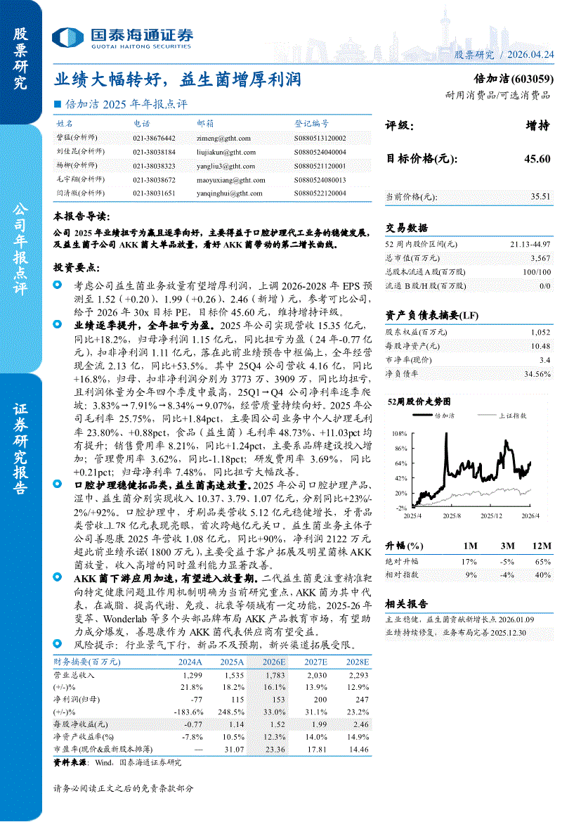 倍加洁:国泰海通证券-倍加洁-603059-2025年年报点评:业绩大幅转好,益生菌增厚利润-260424
