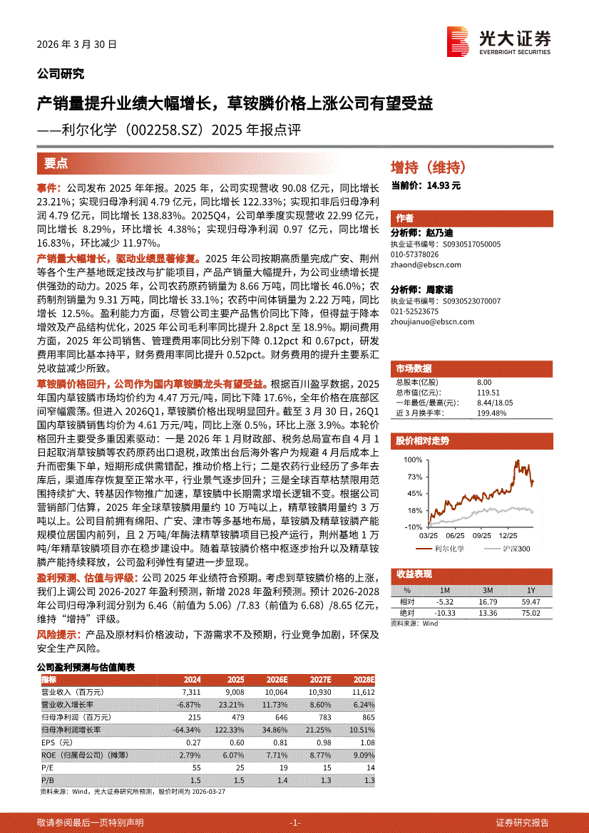 利尔化学:光大证券-利尔化学-002258-2025年报点评:产销量提升业绩大幅增长,草铵膦价格上涨公司有望受益-260330