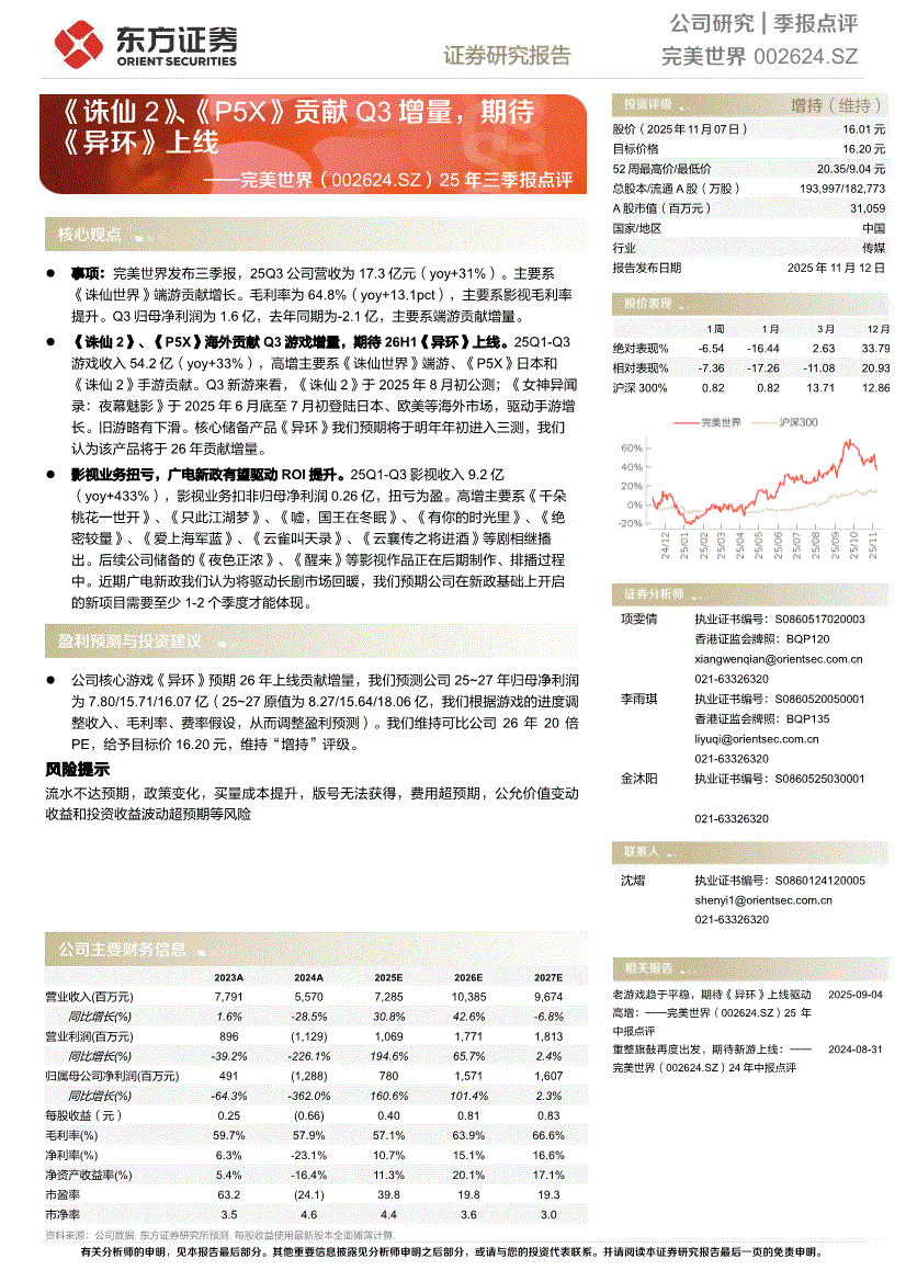 完美世界:东方证券-完美世界-002624-25年三季报点评:《诛仙2》、《P5X》贡献Q3增量,期待《异环》上线-251112