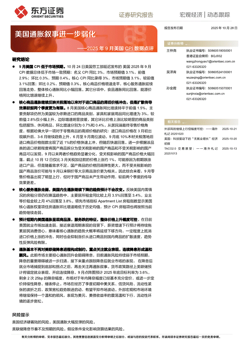 东方证券-2025年9月美国CPI数据点评:美国通胀叙事进一步弱化-251028