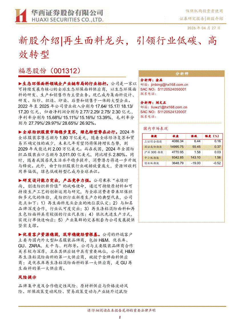福恩股份:华西证券-福恩股份-001312-新股介绍|再生面料龙头,引领行业低碳、高效转型-260427
