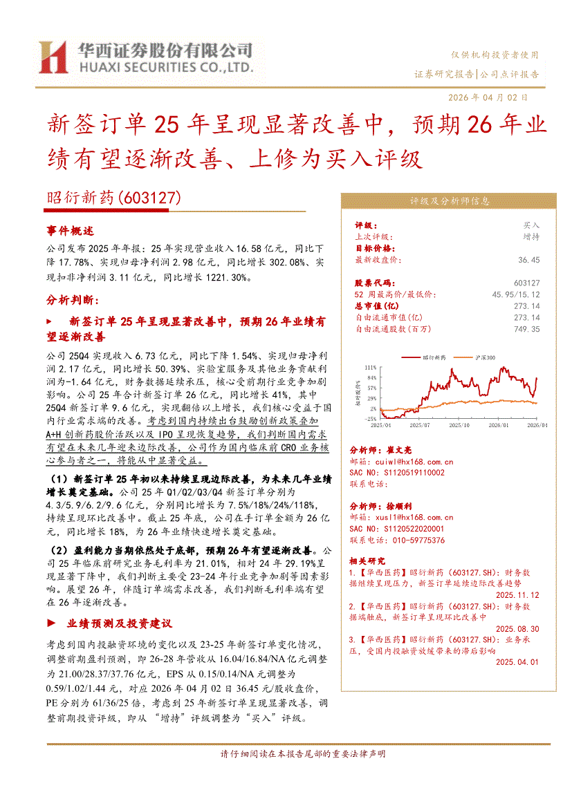 昭衍新药:华西证券-昭衍新药-603127-新签订单25年呈现显著改善中,预期26年业绩有望逐渐改善、上修为买入评级-260402