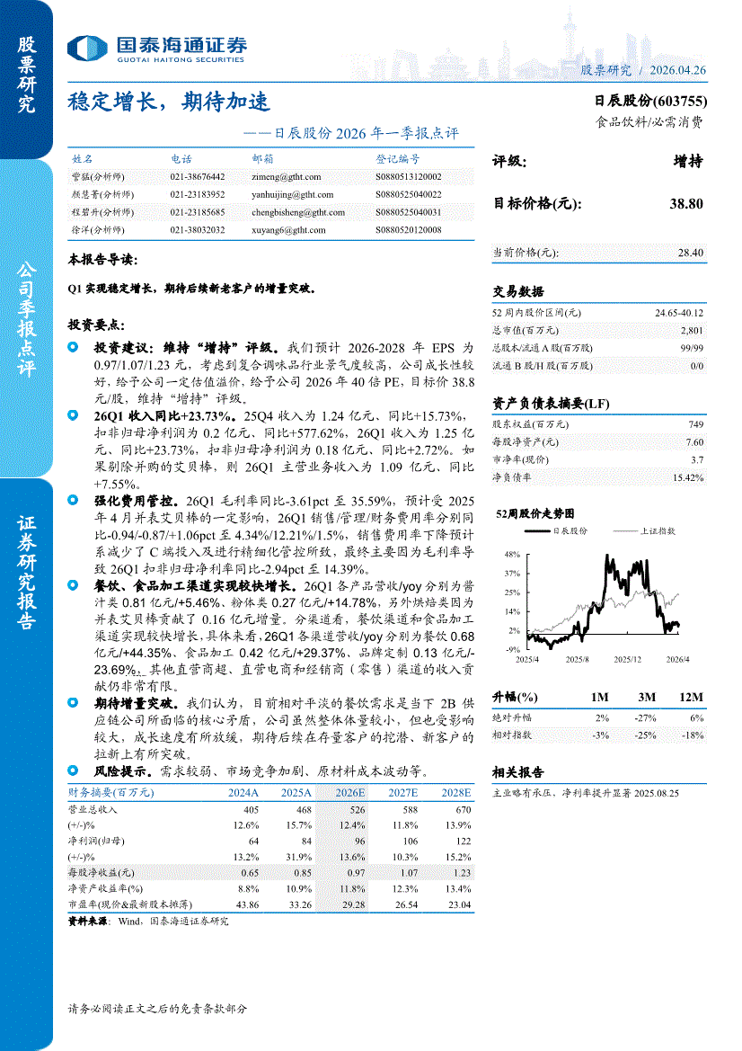 日辰股份:国泰海通证券-日辰股份-603755-2026年一季报点评:稳定增长,期待加速-260426