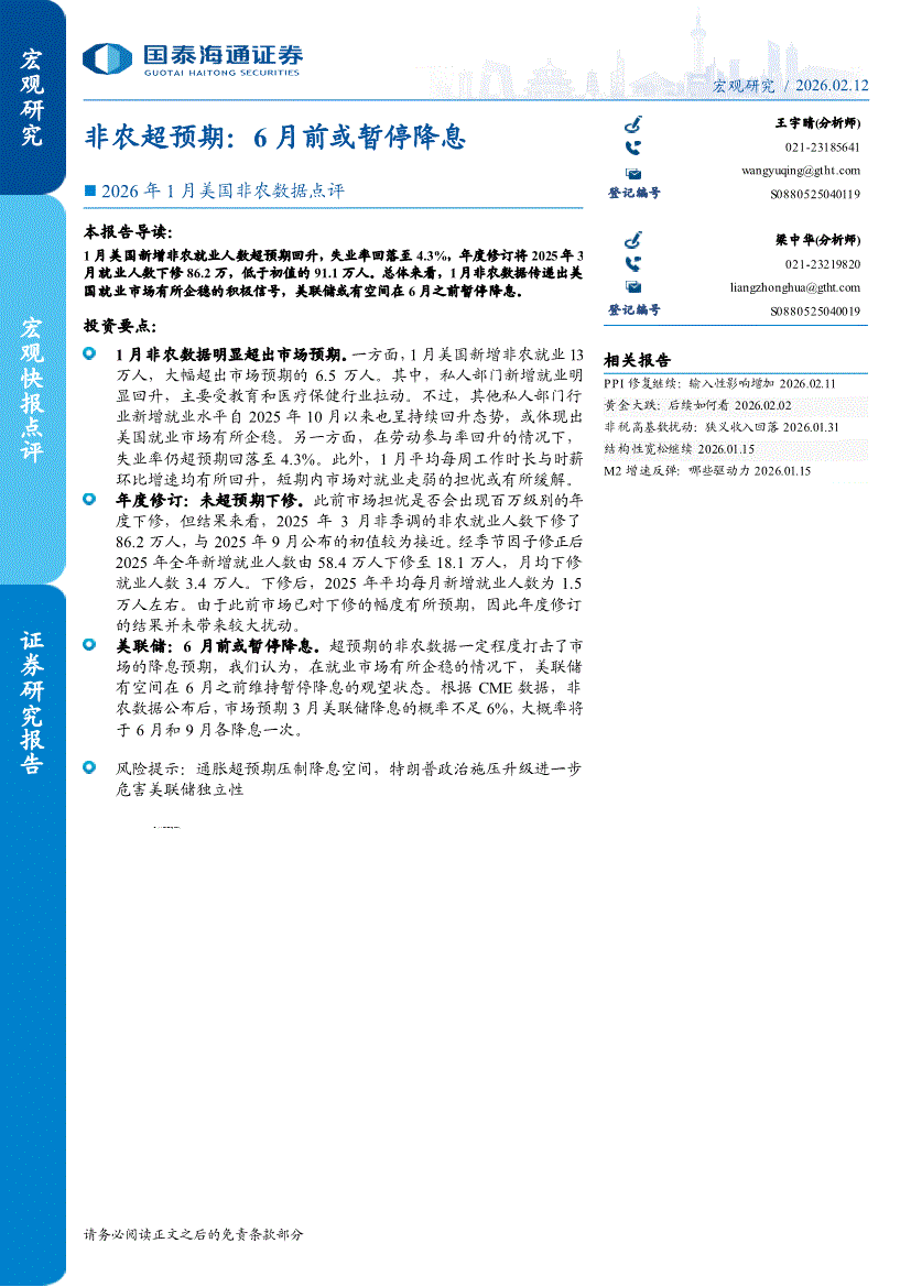 国泰海通证券-2026年1月美国非农数据点评:非农超预期,6月前或暂停降息-260212