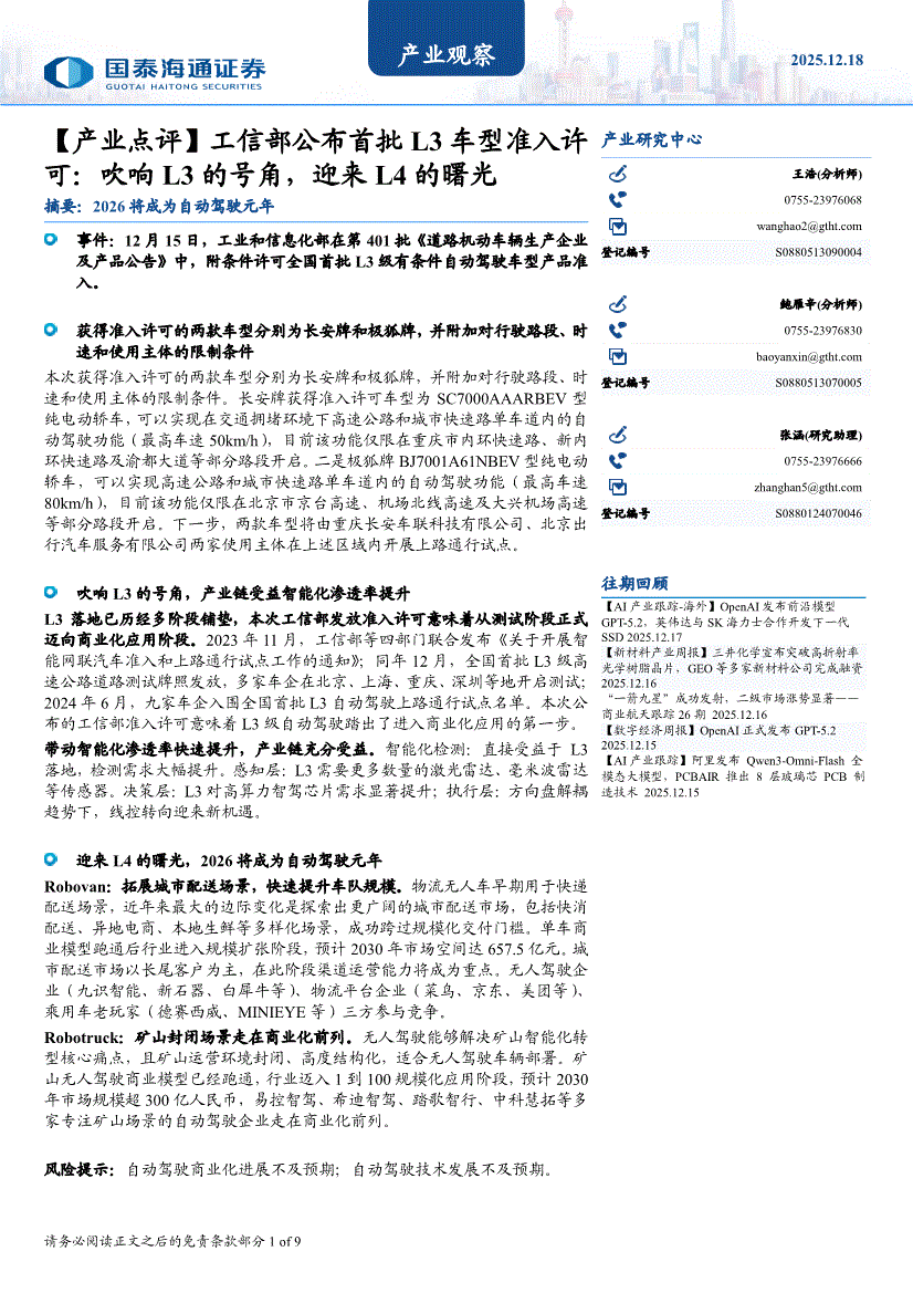 国泰海通证券-产业观察:【产业点评】工信部公布首批L3车型准入许可,吹响L3的号角,迎来L4的曙光-251218