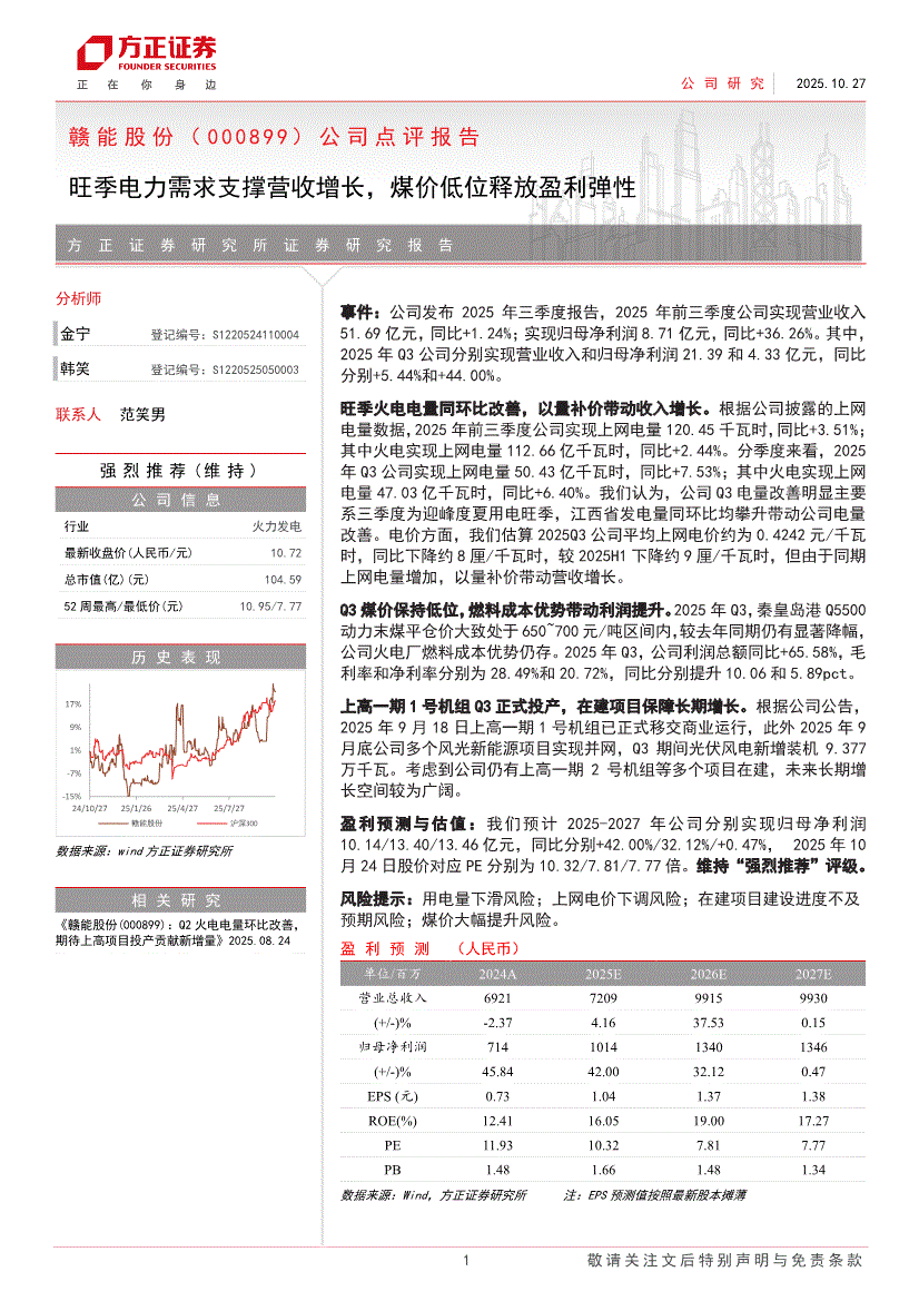 赣能股份:方正证券-赣能股份-000899-公司点评报告:旺季电力需求支撑营收增长,煤价低位释放盈利弹性-251027