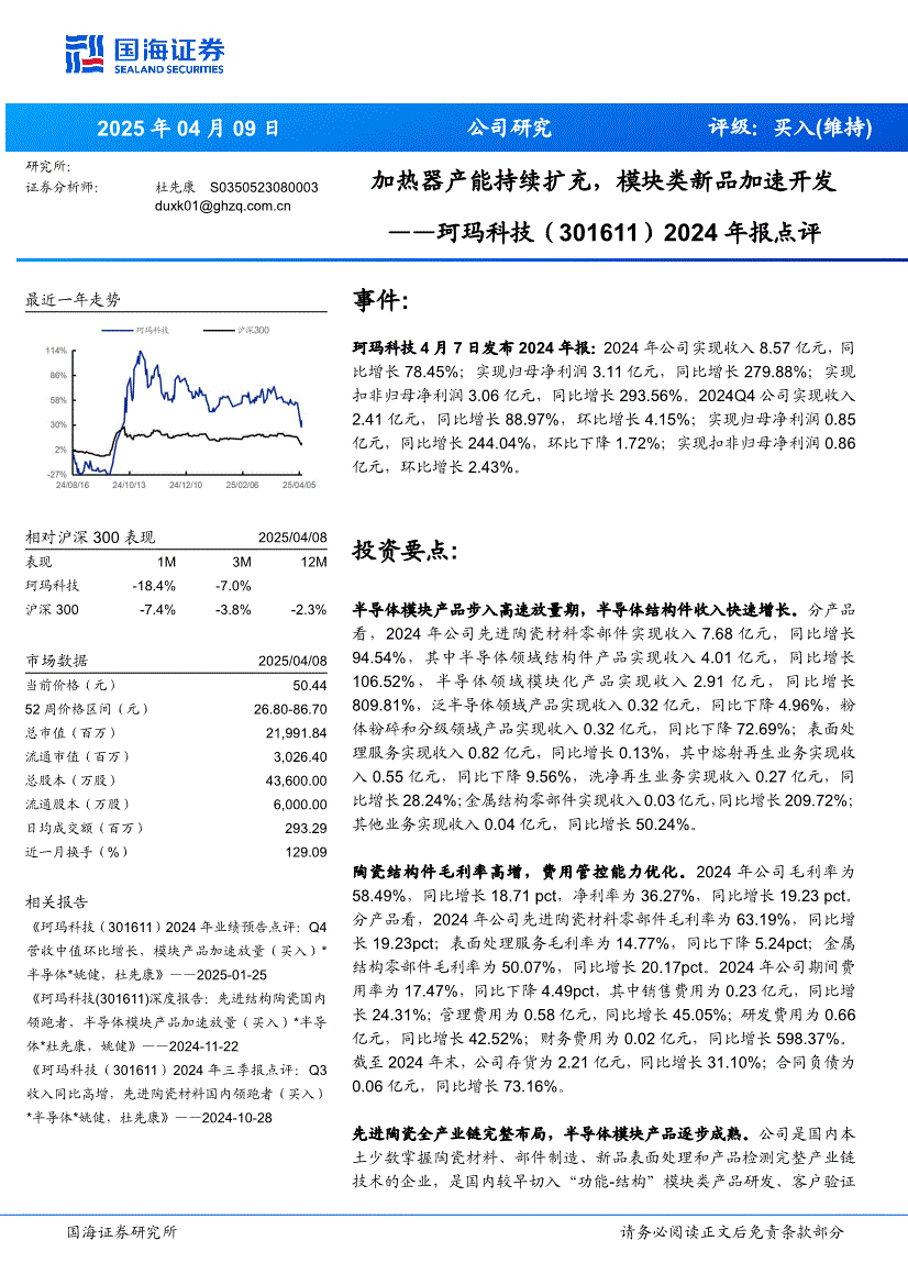 珂玛科技:国海证券-珂玛科技-301611-2024年报点评:加热器产能持续扩充,模块类新品加速开发-250409