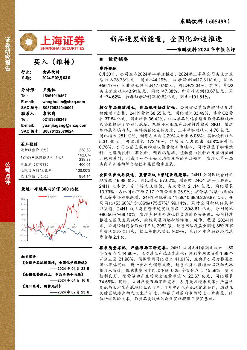 东鹏饮料:上海证券-东鹏饮料-605499-2024年中报点评:新品迸发新能量,全国化加速推进-240903
