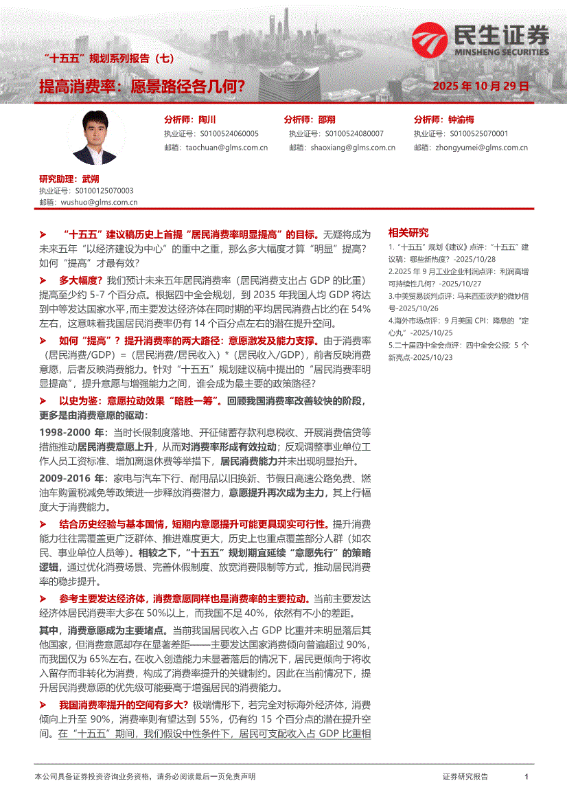 民生证券-“十五五”规划系列报告(七):提高消费率,愿景路径各几何?-251029