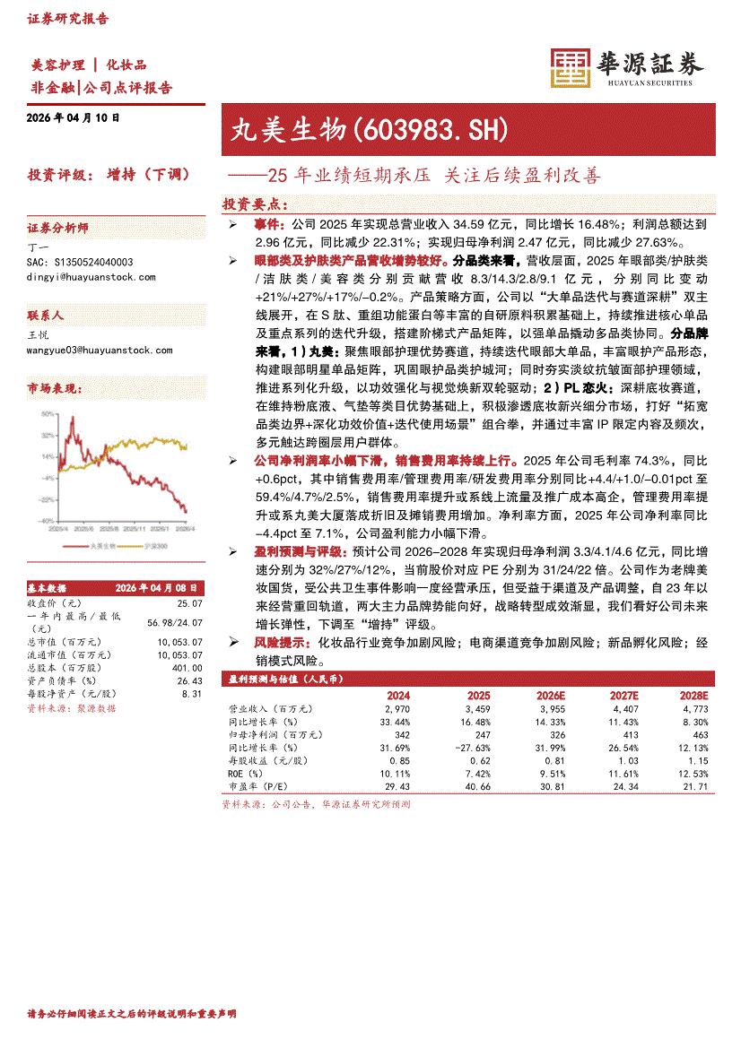丸美生物:华源证券-丸美生物-603983-25年业绩短期承压,关注后续盈利改善-260410