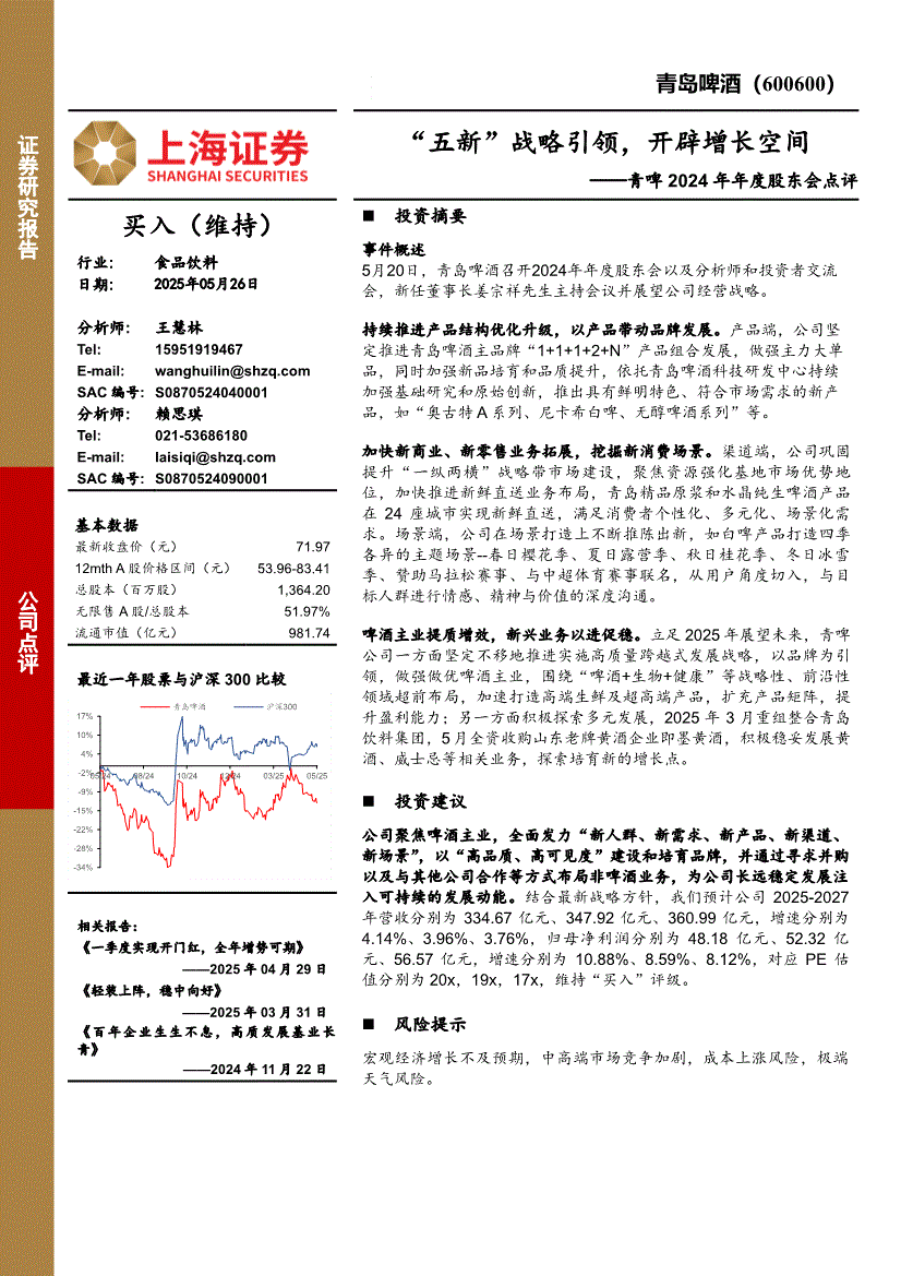 青岛啤酒:上海证券-青岛啤酒-600600-青啤2024年年度股东会点评:“五新”战略引领,开辟增长空间-250526