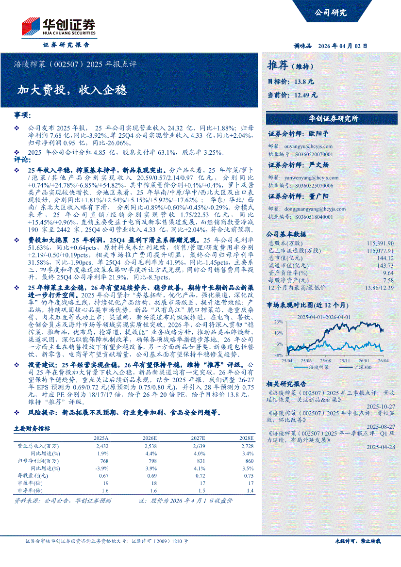 涪陵榨菜:华创证券-涪陵榨菜-002507-2025年报点评:加大费投,收入企稳-260402