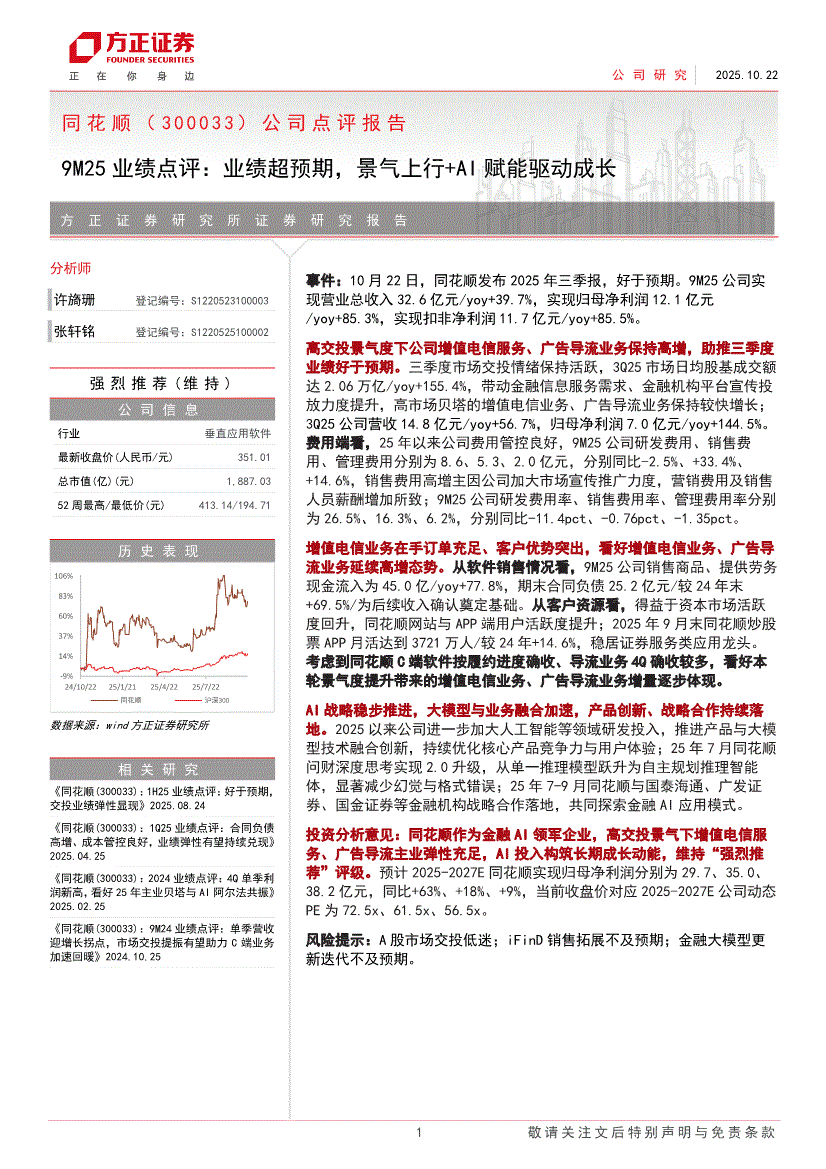 方正证券-同花顺-300033-公司点评报告:9M25业绩点评,业绩超预期,景气上行+AI赋能驱动成长-251022