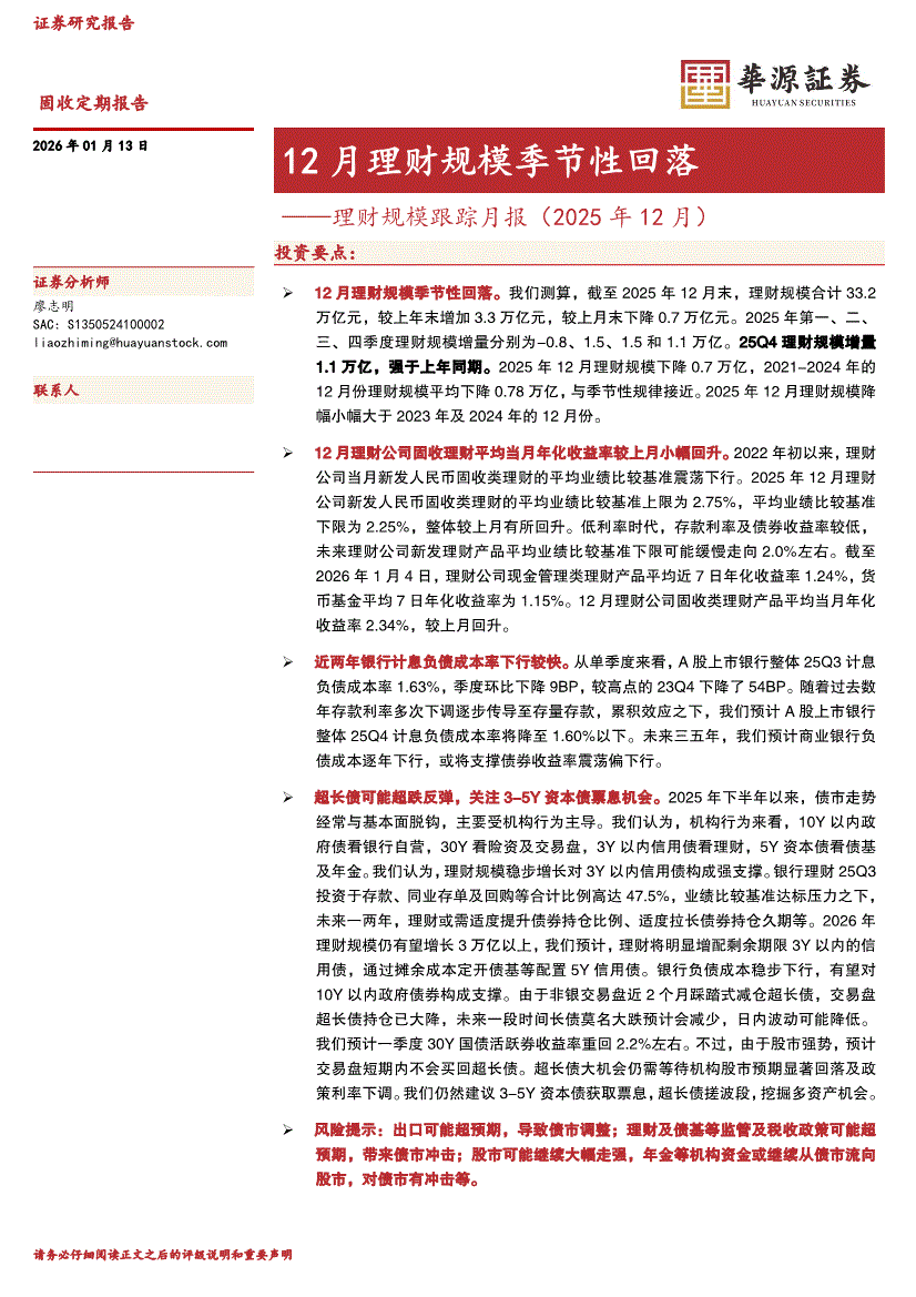 华源证券-理财规模跟踪月报(2025年12月):12月理财规模季节性回落-260113