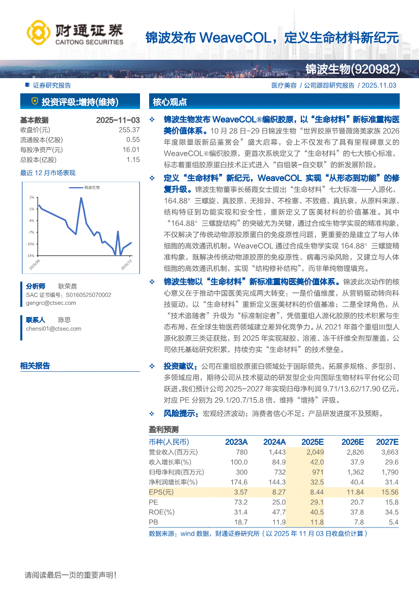 锦波生物:财通证券-锦波生物-920982-锦波发布WEAVECOL,定义生命材料新纪元-251103
