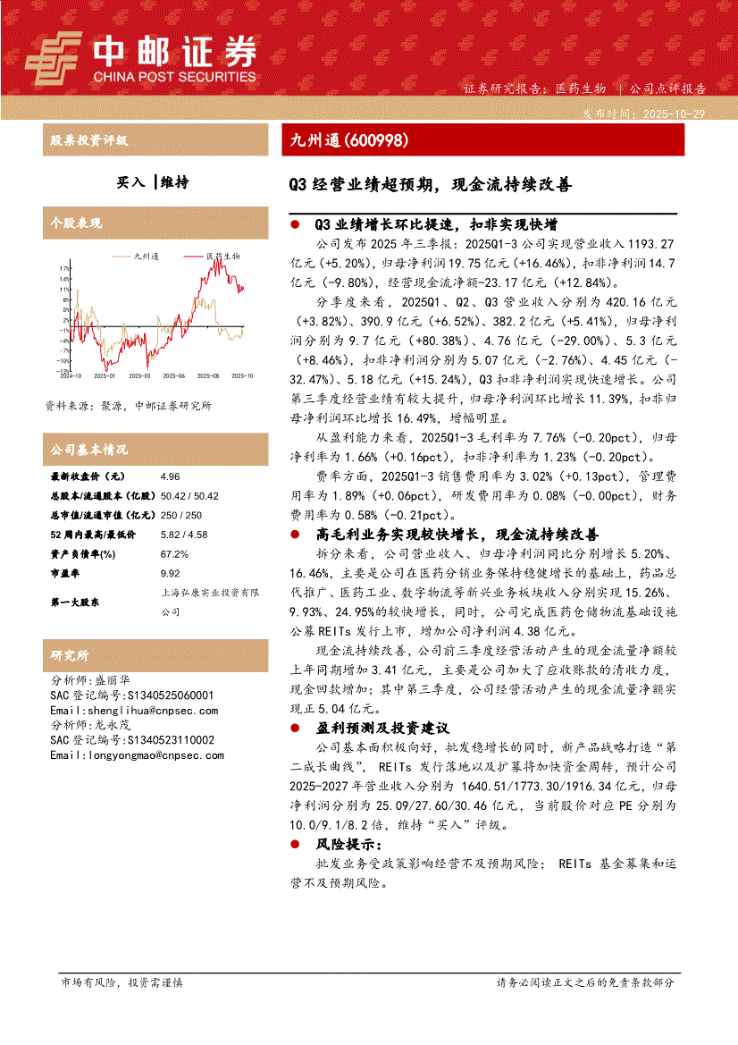 九州通:中邮证券-九州通-600998-Q3经营业绩超预期,现金流持续改善-251029