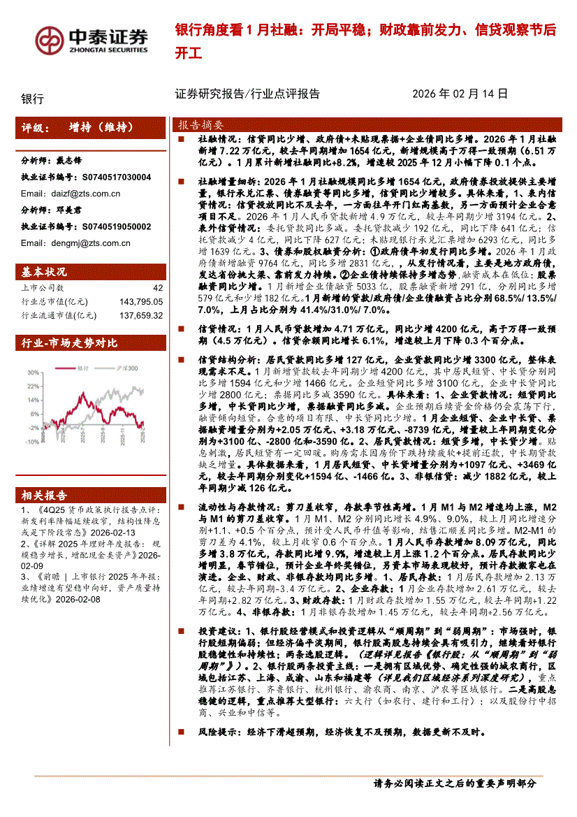 银行业:中泰证券-银行业银行角度看1月社融:开局平稳;财政靠前发力、信贷观察节后开工-260214