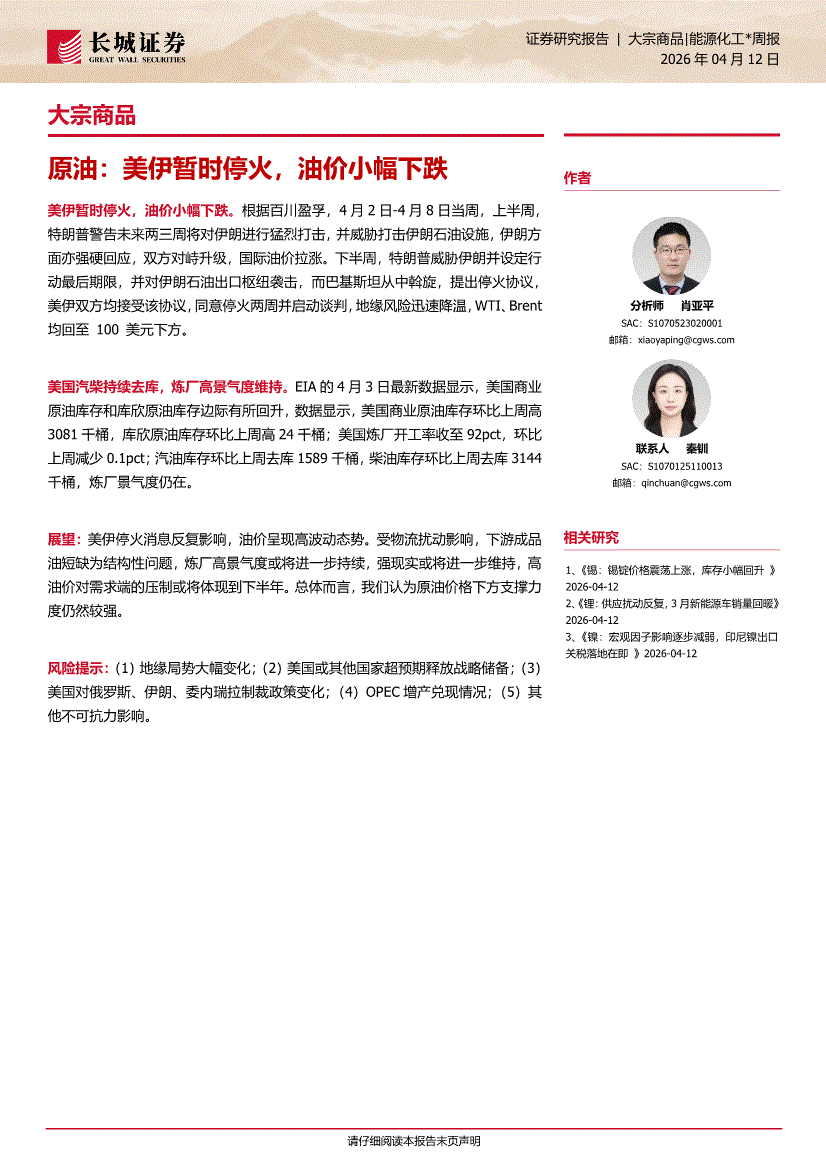 长城证券-大宗商品:原油,美伊暂时停火,油价小幅下跌-260412