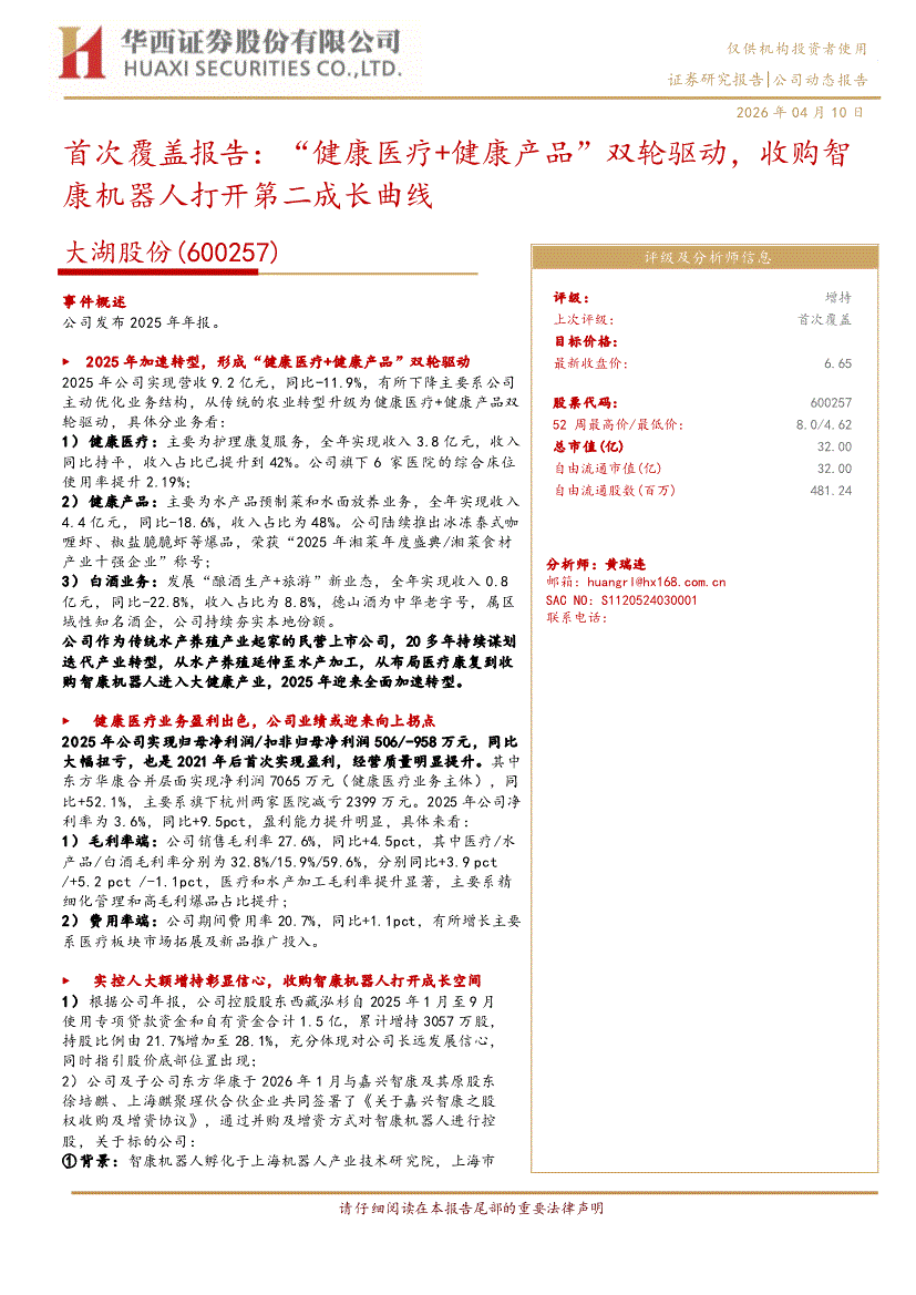 大湖股份:华西证券-大湖股份-600257-首次覆盖报告:“健康医疗+健康产品”双轮驱动,收购智康机器人打开第二成长曲线-260410