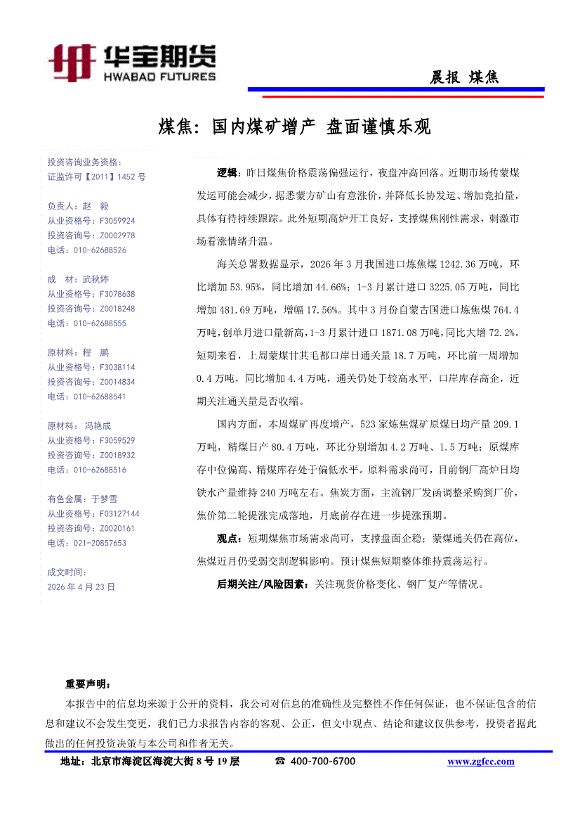 华宝期货-煤焦晨报:国内煤矿增产,盘面谨慎乐观-260423