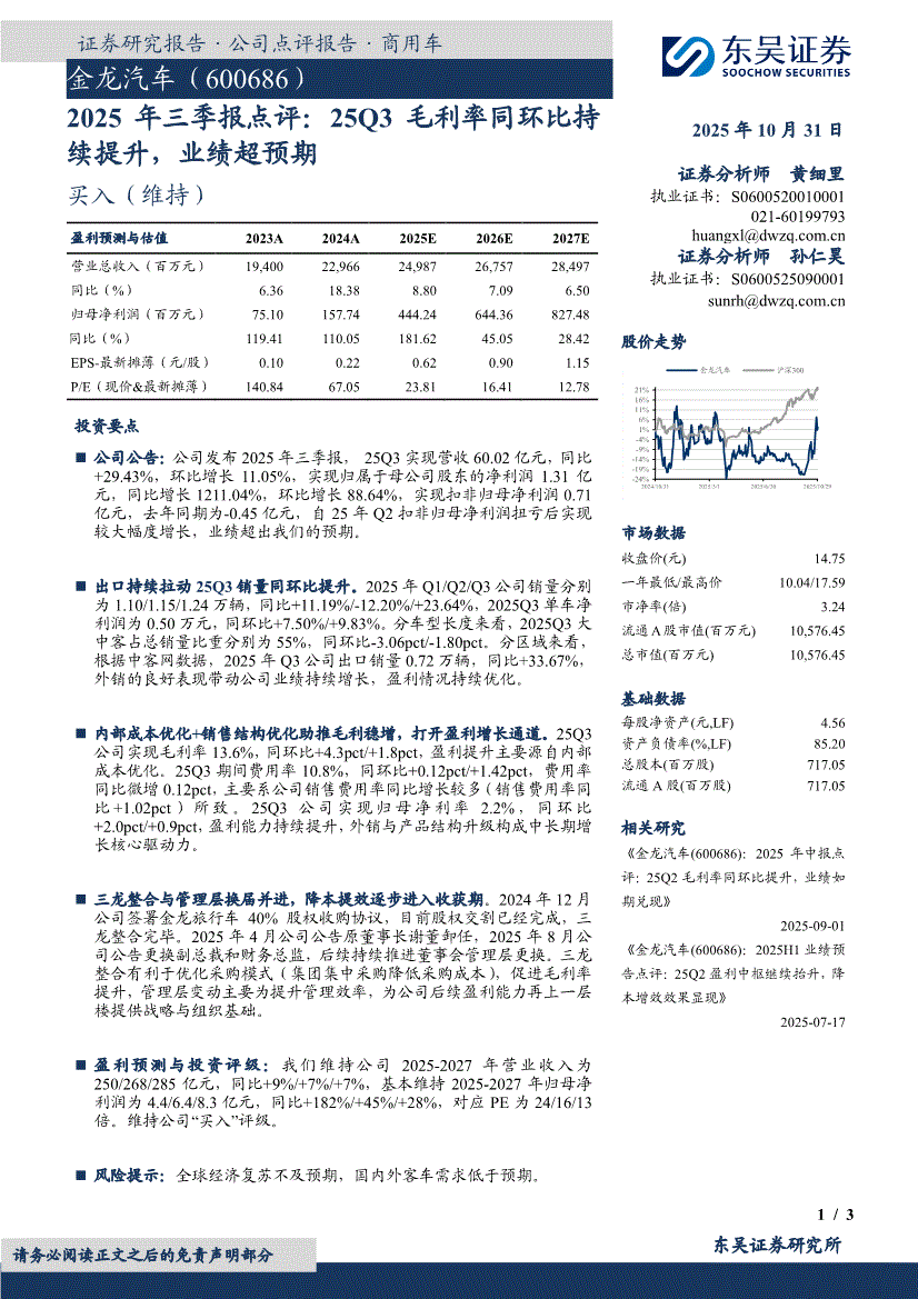 金龙汽车:东吴证券-金龙汽车-600686-2025年三季报点评:25Q3毛利率同环比持续提升,业绩超预期-251031