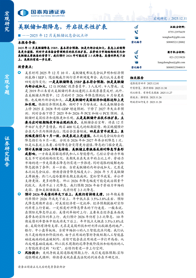 国泰海通证券-2025年12月美联储议息会议点评:美联储如期降息,开启技术性扩表-251211