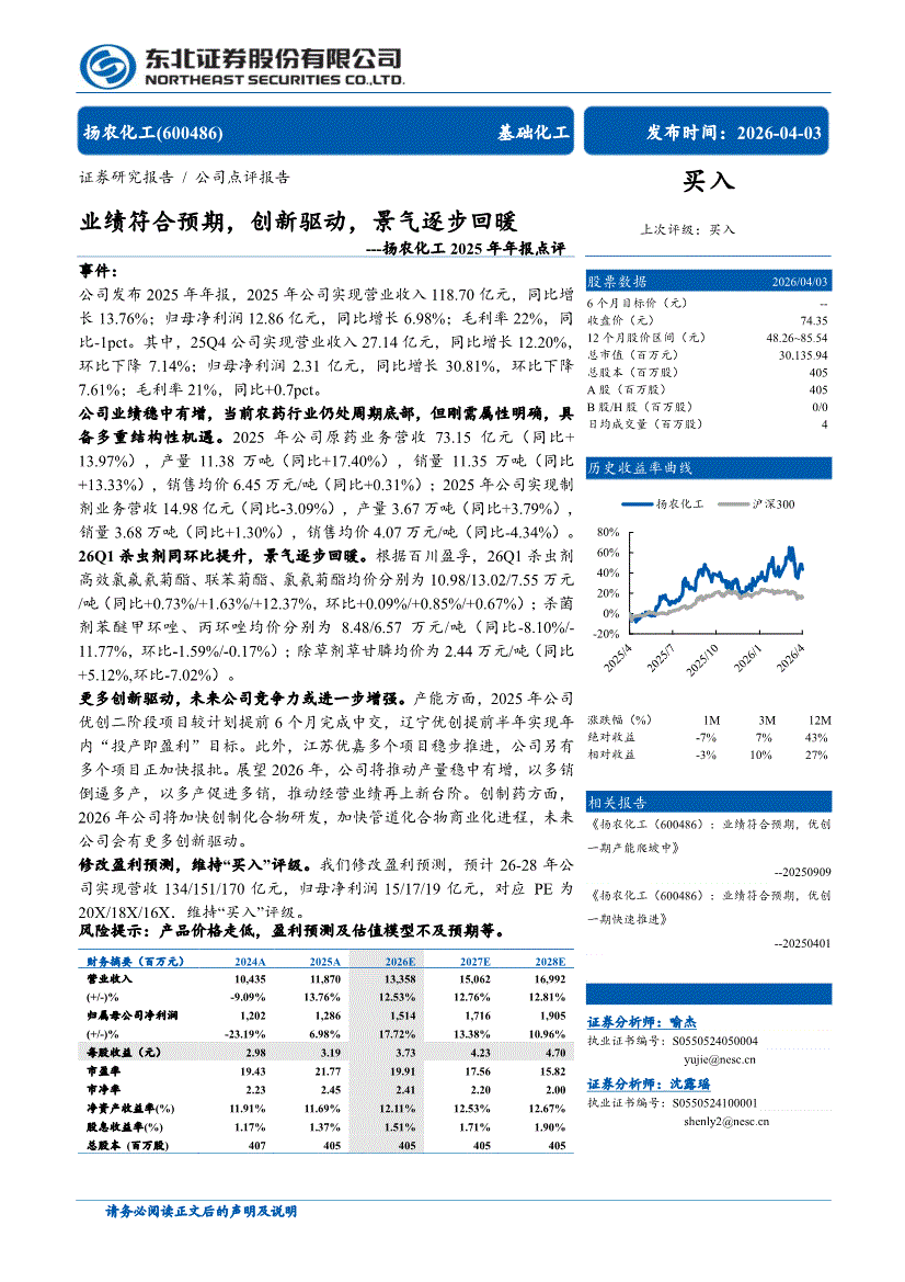 扬农化工:东北证券-扬农化工-600486-2025年年报点评:业绩符合预期,创新驱动,景气逐步回暖-260403