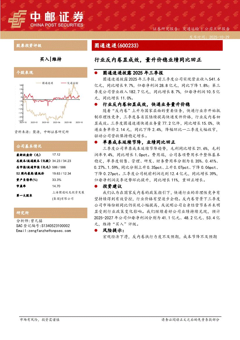 圆通速递:中邮证券-圆通速递-600233-行业反内卷显成效,量升价稳业绩同比回正-251029