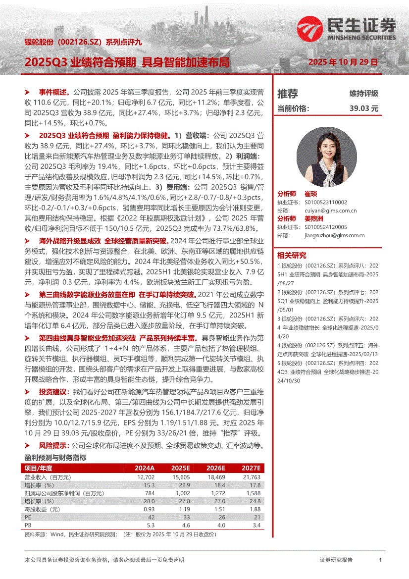 银轮股份:民生证券-银轮股份-002126-系列点评九:2025Q3业绩符合预期,具身智能加速布局-251029