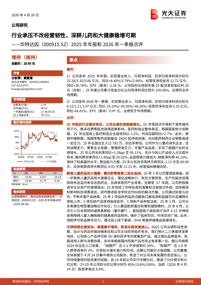 华特达因:光大证券-华特达因-000915-2025年年报和2026年一季报点评:行业承压不改经营韧性,深耕儿药和大健康稳增可期-260426