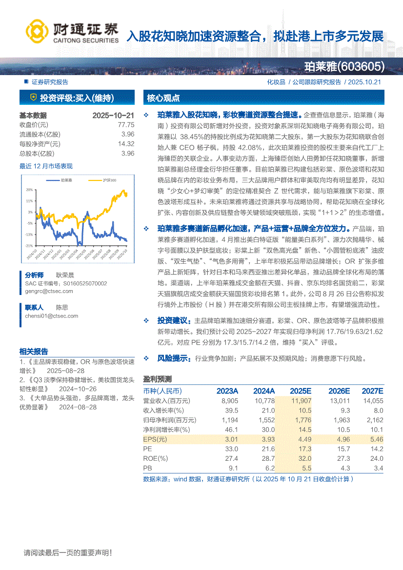 珀莱雅:财通证券-珀莱雅-603605-入股花知晓加速资源整合,拟赴港上市多元发展-251021
