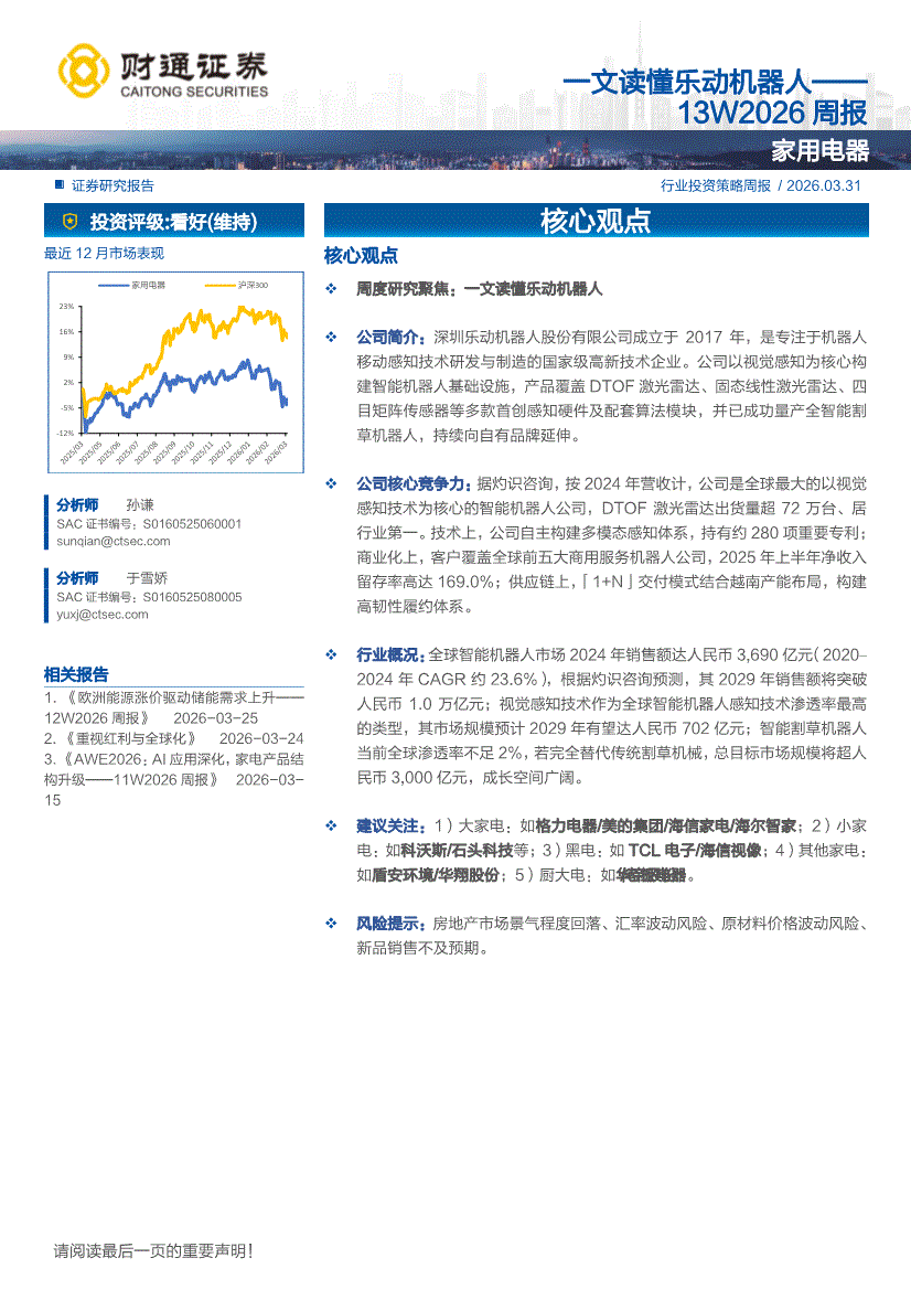 家用电器行业:财通证券-家用电器行业13W2026周报:一文读懂乐动机器人-260331