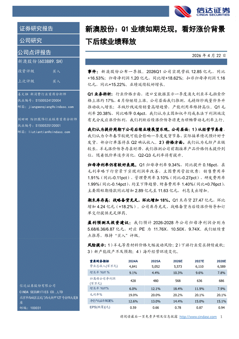 新澳股份:信达证券-新澳股份-603889-Q1业绩如期兑现,看好涨价背景下后续业绩释放-260422