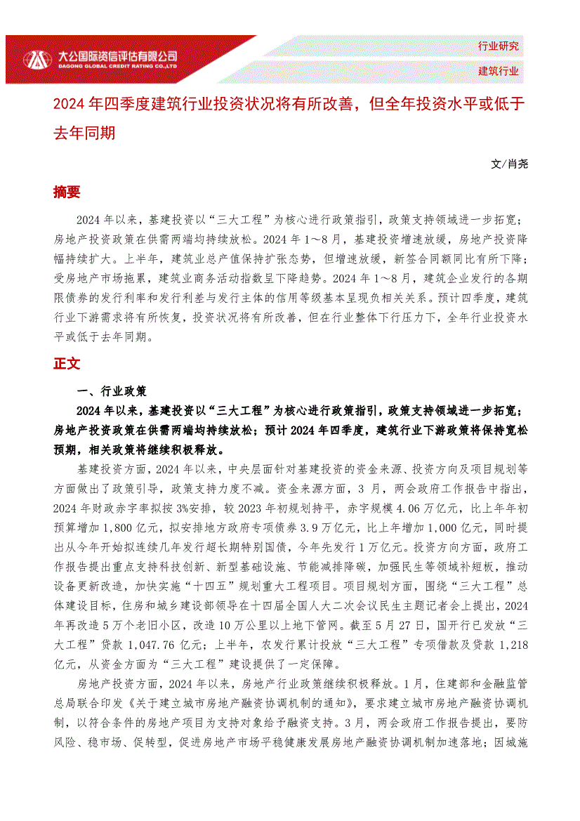建筑行业:大公国际-2024年四季度建筑行业投资状况将有所改善,但全年投资水平或低于去年同期-241008