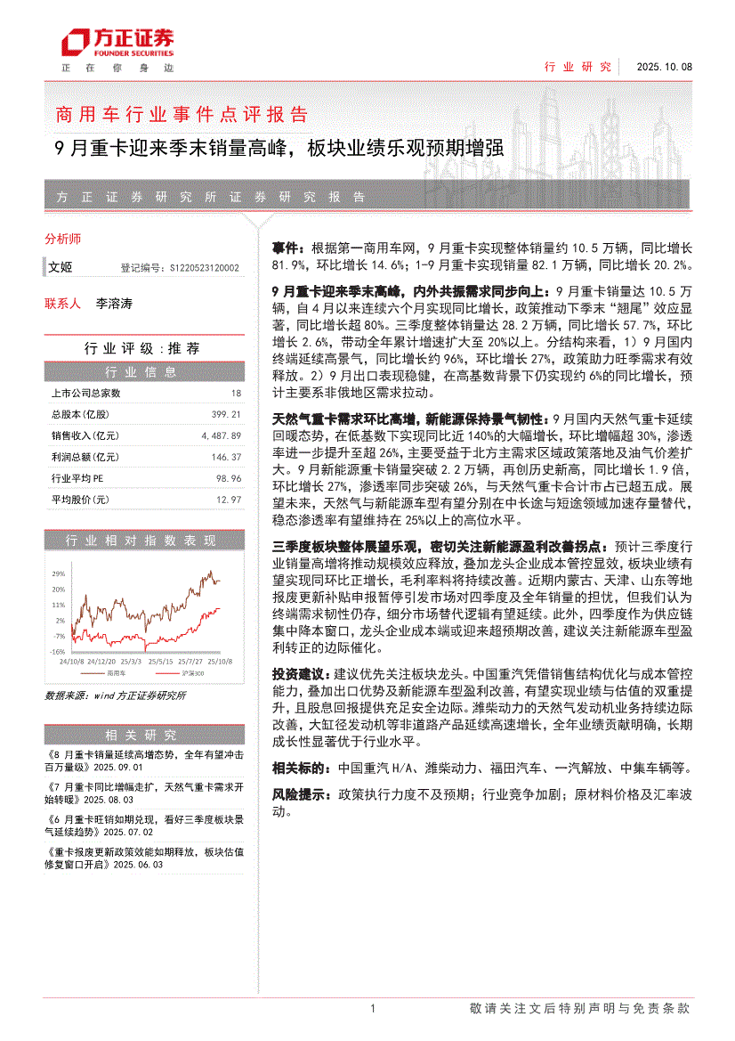 商用车行业:方正证券-商用车行业事件点评报告:9月重卡迎来季末销量高峰,板块业绩乐观预期增强-251008