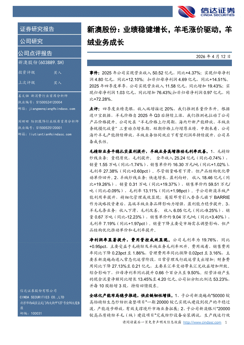 新澳股份:信达证券-新澳股份-603889-业绩稳健增长,羊毛涨价驱动,羊绒业务成长-260412
