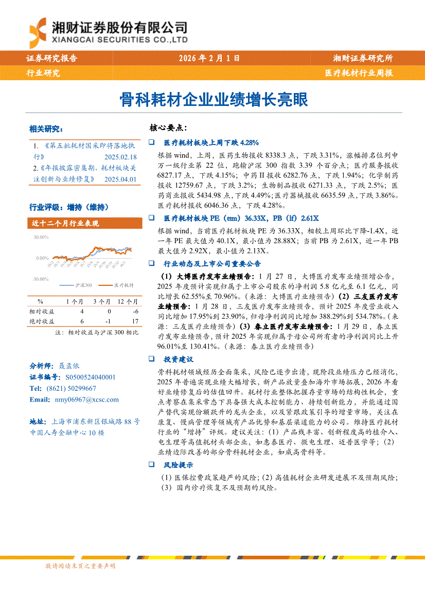 医疗耗材行业:湘财证券-医疗耗材行业周报:骨科耗材企业业绩增长亮眼-260201